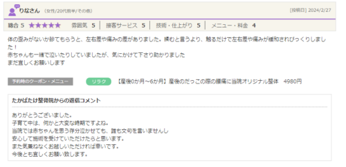 24/2/27 子育て中の方 2024 10/31 患者さまの声 2024年2月27日2024年10月31日 体の歪みがないか診てもらうと、左右差や痛みの差がありました。 揉むというより、触るだけで左右差や痛みが緩和されびっくりしました! 赤ちゃんも一緒で泣いたりしていましたが、気にかけて下さり助かりました。 また宜しくお願いします。 患者さまの声 よかったらシェアしてね! URLをコピーしました! URLをコピーしました! 産前・産後の整体 24/3/9 腰痛の方 この記事を書いた人 たかばたけ整骨院 札幌市白石区東札幌にあります。 ぎっくり腰・坐骨神経痛・自律神経障害・慢性腰痛etcどこにいってもよくならなかった方が集まる整骨院です。 保有資格:柔道整復師・JSPO-AT・DRTインストラクター 自賠責や労災にも対応 ☎:0113765761 ✉:takabatakehone@gmail.com LINEID:@takabatakehone 関連記事 24/11 腰痛・膝痛で歩行時痛のある方 2024年11月21日 24/10/31 坐骨神経痛の方 2024年11月1日 24/9/10 テニス肘五十肩 2024年10月11日 24/9/21 肩こり腰痛の方 2024年10月10日 ’24/4/8 寝違えの患者様 2024年4月8日 24/4/1 妊娠初期 ぎっくり腰の方 2024年4月1日 ’24/3/26 首肩背中の痛み 2024年3月26日 24/3/9 腰痛の方 2024年3月9日